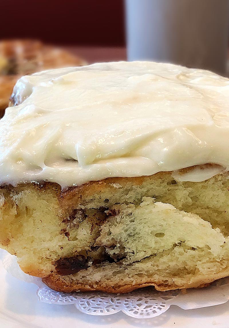 Our homemade cinnamon roll made with cream cheese frosting with a maple twist and bacon pieces throughout.